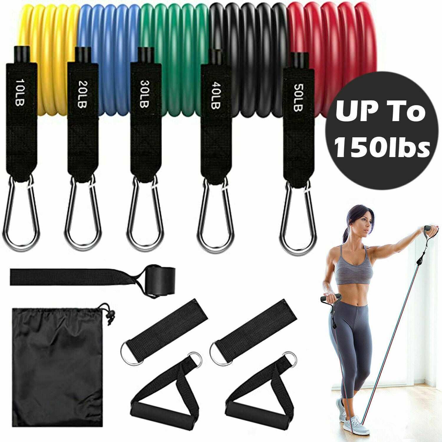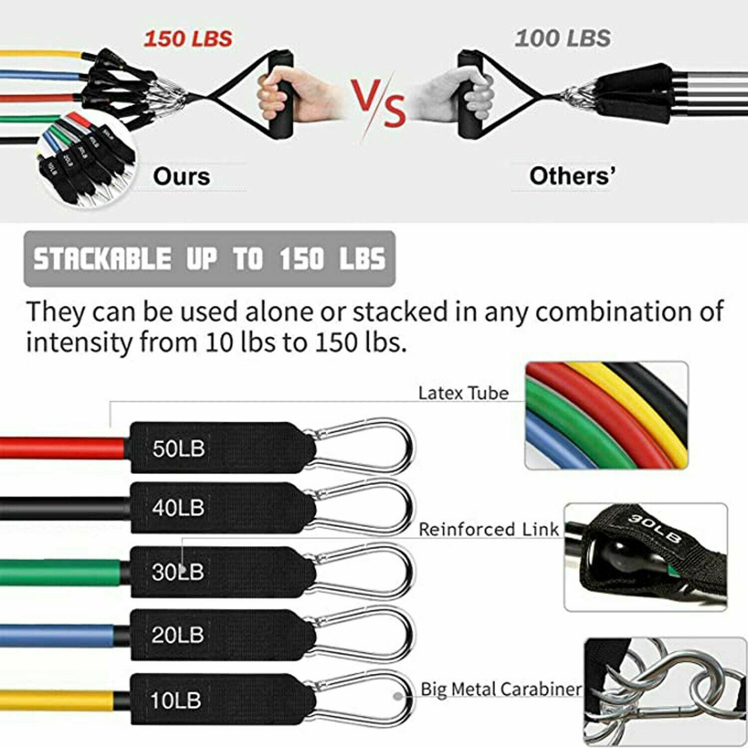 FOR ALL FITNESS LEVELS, COMBINABLE STRENGTH - Our bands are individually labeled and color-coded based on their resistance levels. You may use them alone or stacked in a combination of up to 150lbs.