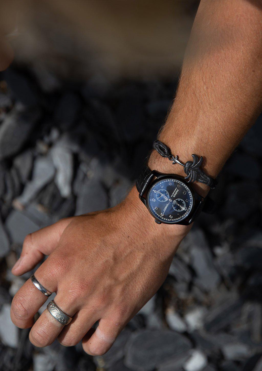 Phantom Black single is a perfectly executed wristband, a beautiful black palm anchor and black / grey nylon bracelet band. A true classic that easily matches every suit in your closet as well as your beach wear.